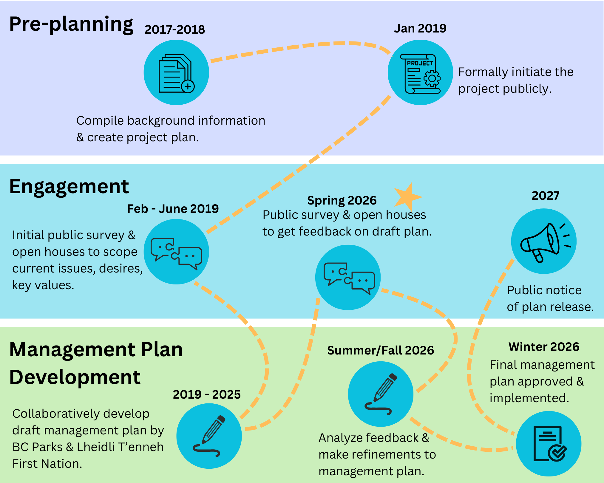 Over the next several years a draft management plan was collaboratively worked on by Lheidli T’enneh and BC Parks staff. Review the graphic below to see what has been completed and the anticipated timeline for the next steps.