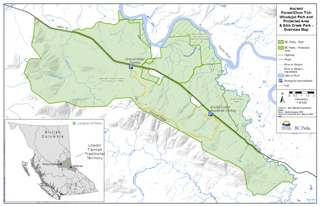Ancient Forest/Chun T’oh Whudujut Park and Protected Area and Slim Creek Park (the parks) lie solely within the territory of the Lheidli T’enneh Nation (Lheidli T’enneh). The parks are located along the upper reaches of the Fraser River 115 km east of Prince George, and 95 km west of McBride, on Highway 16. The parks extend to the north-northeast from the height of land on Driscoll Ridge down to the Fraser River.