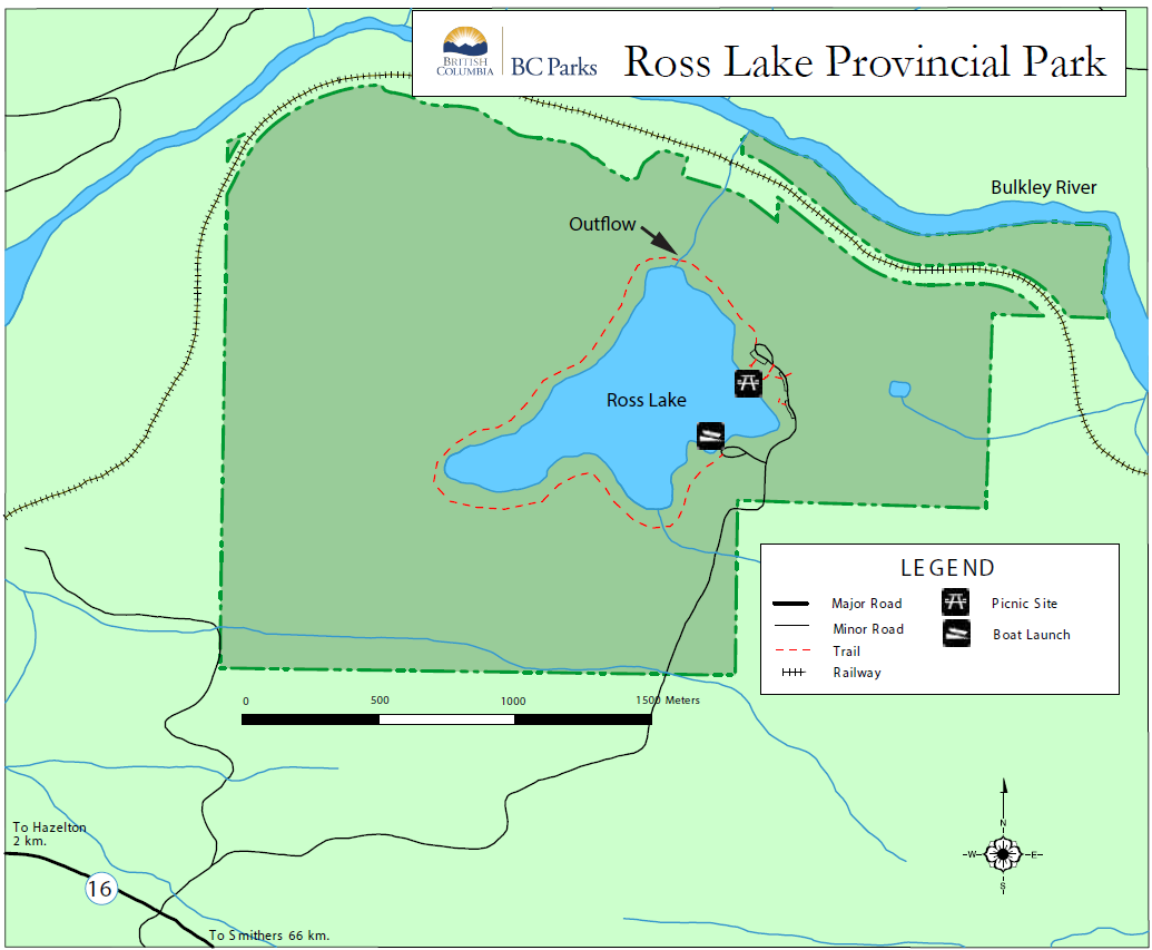 - An earthen berm dam was built on the north end of Ross Lake in the early 1900s. After a wet summer and fall in 2020, the outlet plugged and the lake flooded, posing a threat to the Bulkley River downstream of the lake. After consulting with Gitxsan, Hazelton, and regulatory authorities, BC Parks commissioned extensive environmental and engineering studies to determine how to safely remediate the dam without harming the fish, birds and amphibians that call the park home. In the fall of 2022, a construction crew removed the earthen dam, and the lake is now approximately 30cm to 45cm (12” to 18”) lower.
