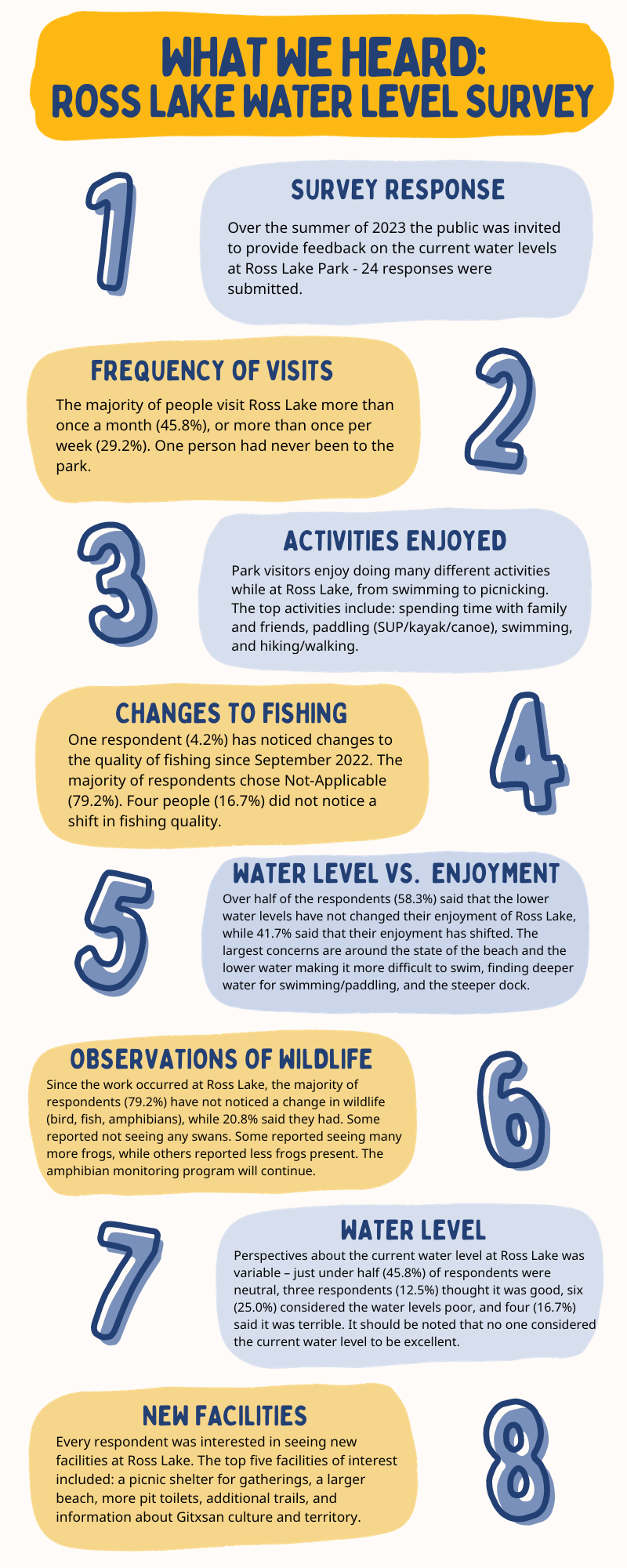 What We Heard: It was clearly heard that Ross Lake Provincial Park is an important recreational area for the surrounding communities. Families and individuals alike enjoy the beautiful setting and the access to nature that Ross Lake provides. In particular, it is an ideal place for people to gather and kids to play/learn how to swim. There are a variety of activities that people enjoy at the lake, from hiking, paddling and swimming, to picnicking and spending time with family and friends. Several improvements are needed at Ross Lake, particularly with regards to the beach and day-use area. Every respondent was interested in seeing some new facilities at Ross Lake. The top five facilities of interest included: a picnic shelter for gatherings, a bigger beach, more pit toilets, additional trails, and information about Gitxsan culture and territory.